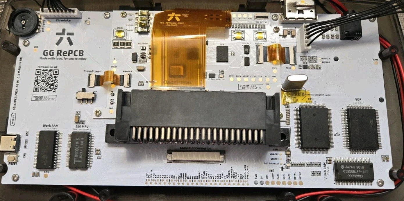 Brand New Retrosix "RePCB" Mainboard – recreation of the Game Gear PCB with the original Z80 CPU & ASICs transplanted for authentic gameplay.